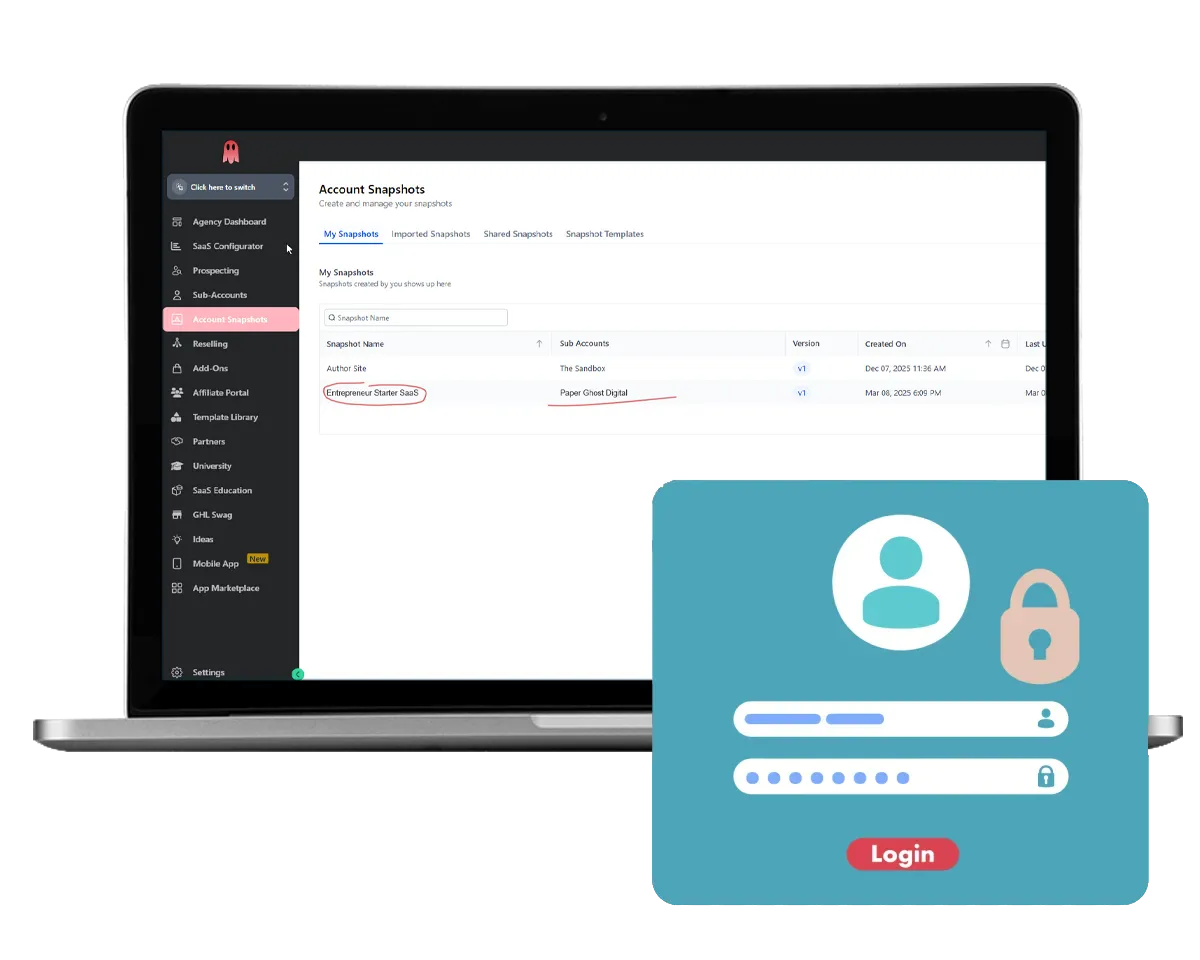 This snapshot includes a simple CRM, lead pipeline, starter website and funnel, follow-up tools, and planning systems already connected.